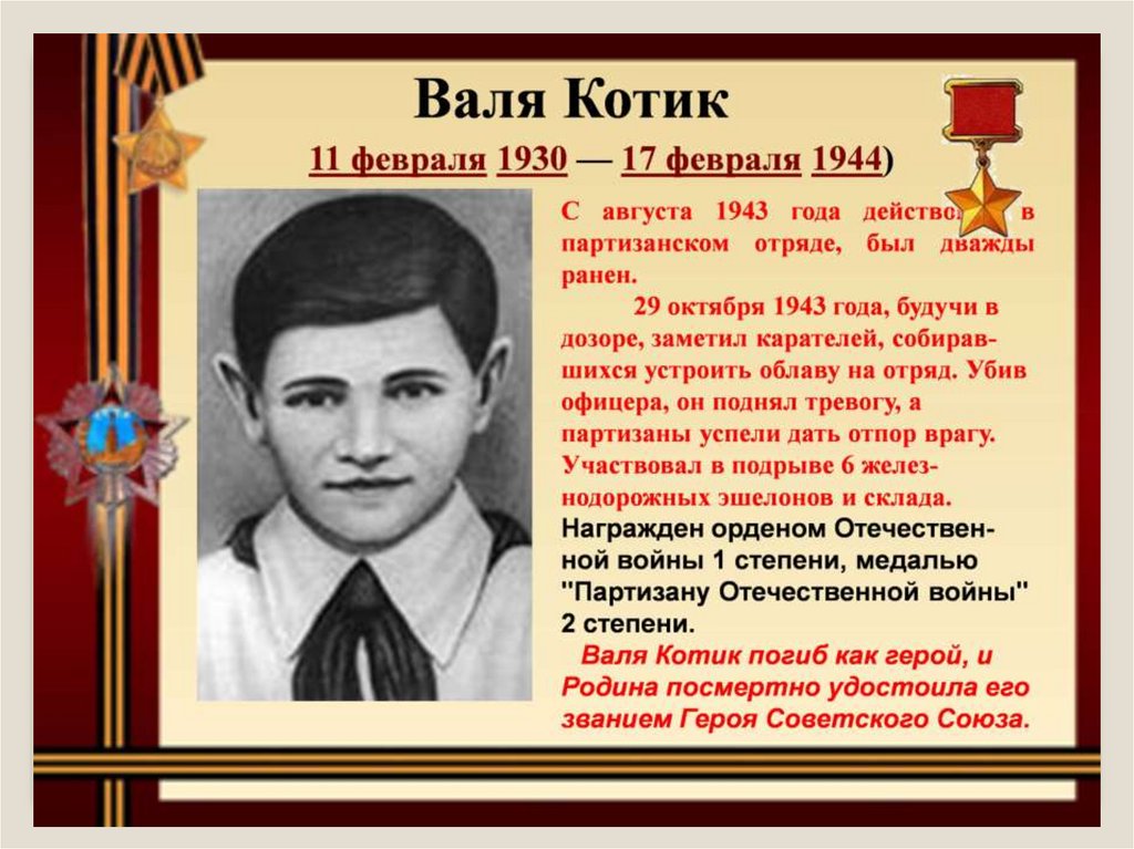 В послужном списке юного партизана числится множествоотважных поступков. Валя не раз рисковал своей жизнью, принимая