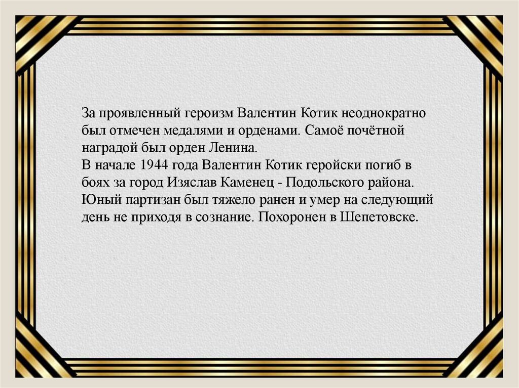 За проявленный героизм Валентин Котик неоднократнобыл отмечен медалями и орденами. Самоё почётной