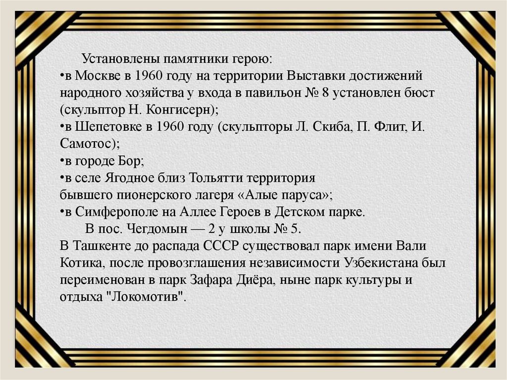 Установлены памятники герою:•в Москве в 1960 году на территории Выставки достижений