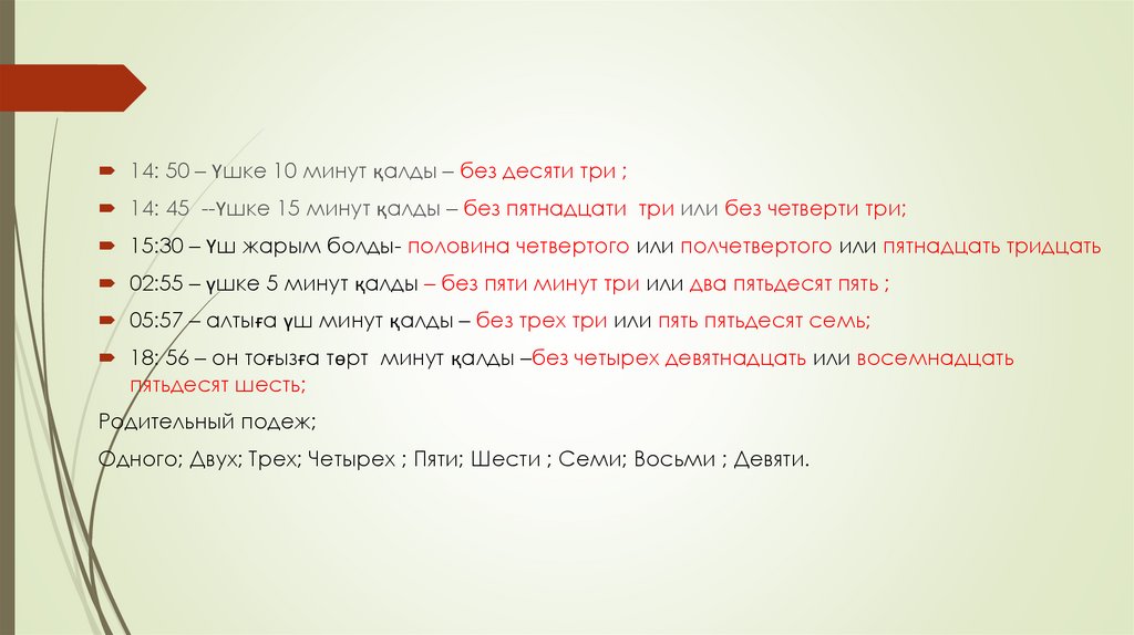 14: 50 – Үшке 10 минут қалды – без десяти три ;14: 45 --Үшке 15 минут қалды – без пятнадцати три или без четверти три;