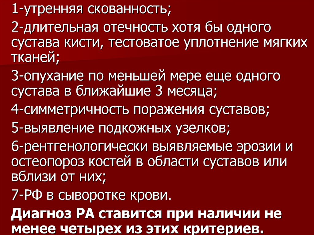 1-утренняя скованность;2-длительная отечность хотя бы одного