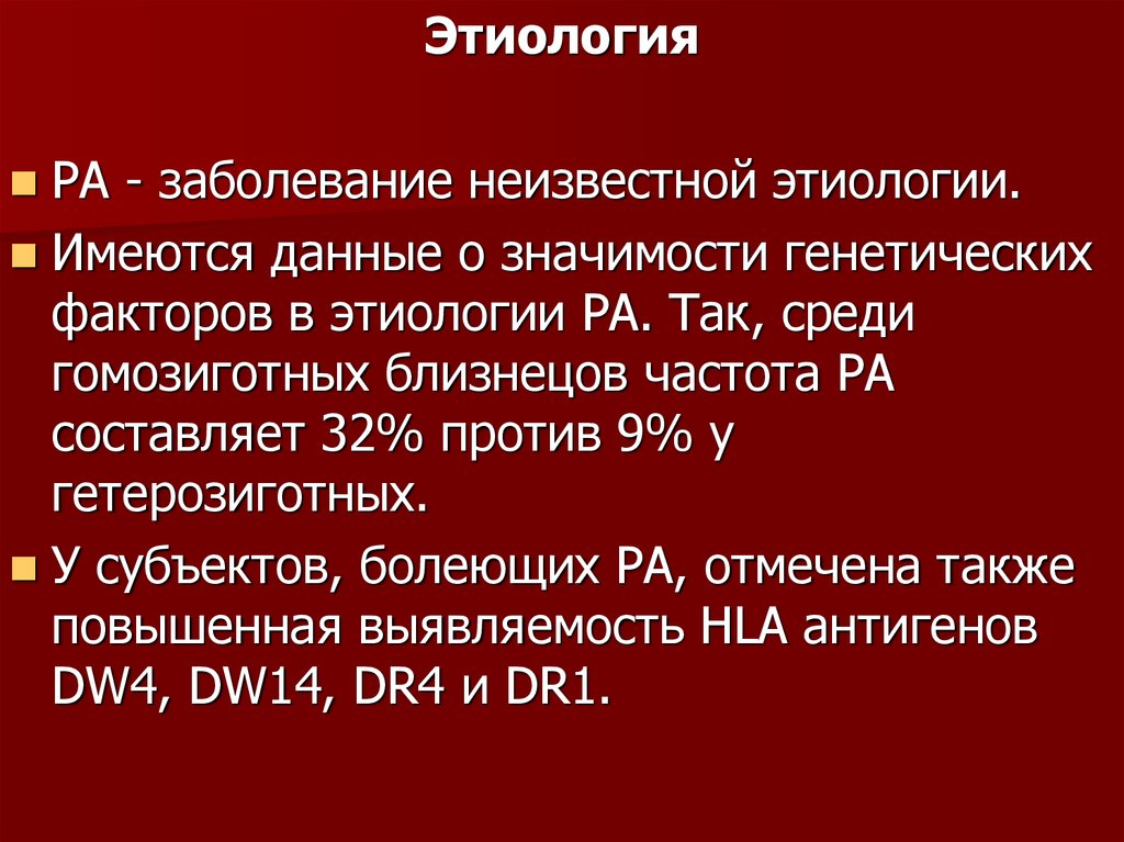 ЭтиологияРА - заболевание неизвестной этиологии.