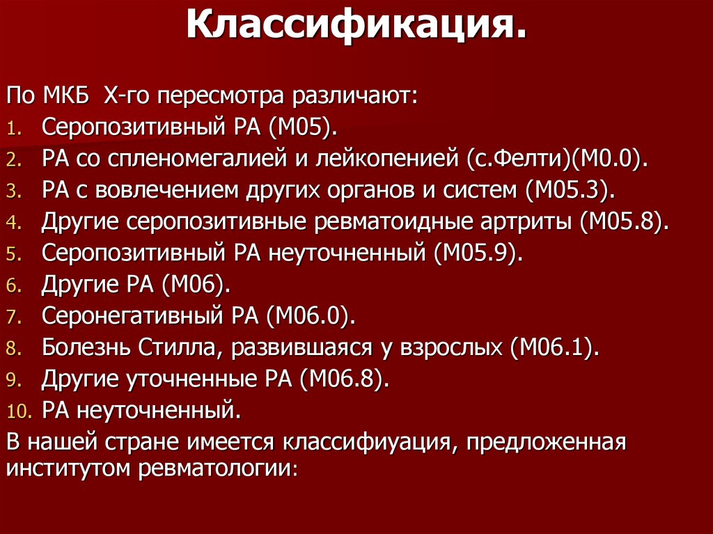 По формам:1. РА (с уточнением - полиартрит, олигоартрит,