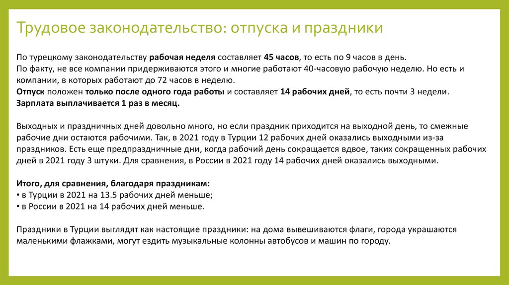 Трудовое законодательство: отпуска и праздникиПо турецкому законодательству рабочая неделя составляет 45 часов, то есть по 9 часов в день.