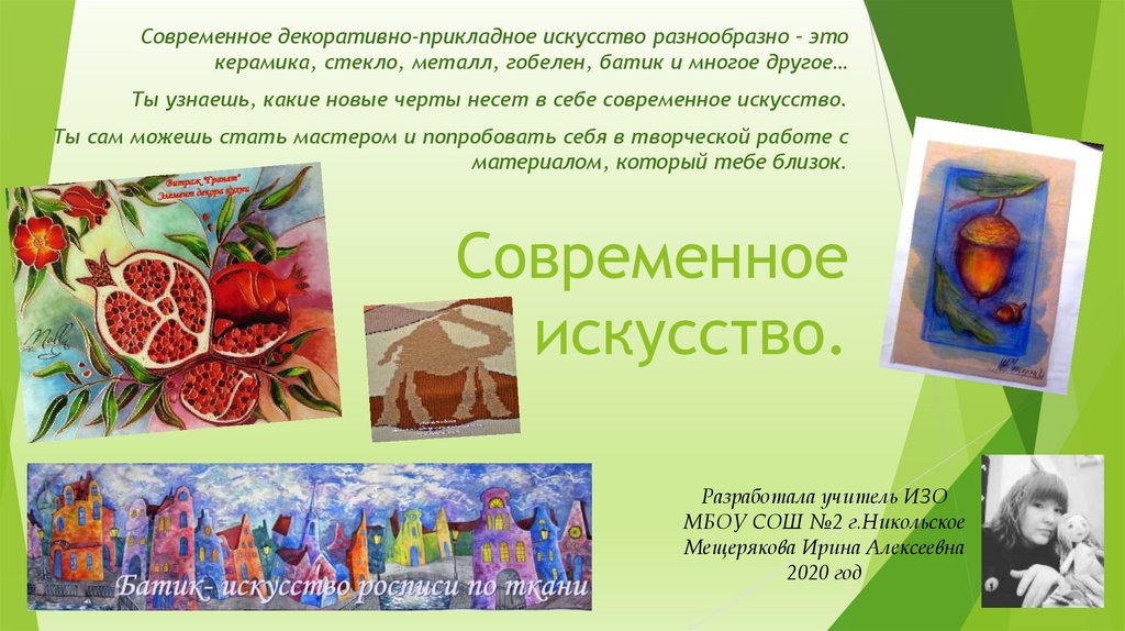 Современное декоративно-прикладное искусство разнообразно – этокерамика, стекло, металл, гобелен, батик и многое другое…