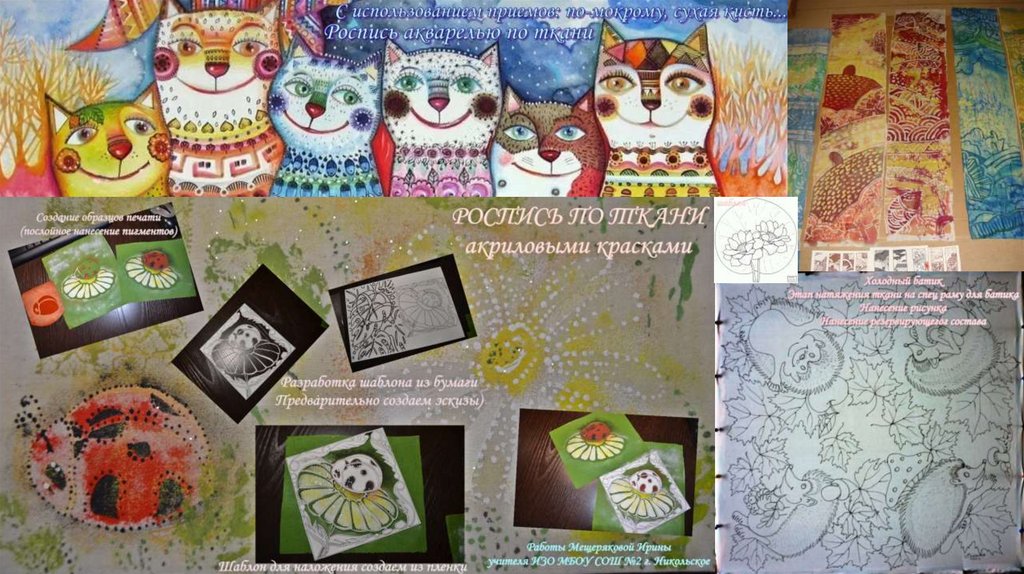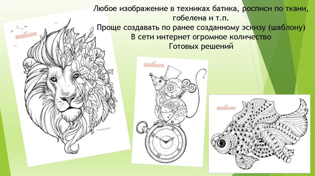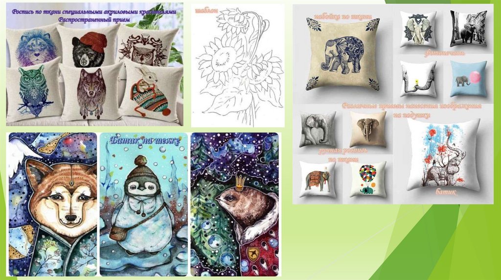 Любое изображение в техниках батика, росписи по ткани,гобелена и т.п.