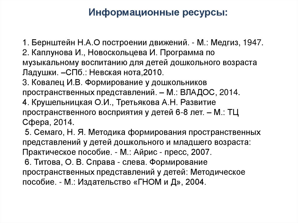 Информационные ресурсы:1. Бернштейн Н.А.О построении движений. - М.: Медгиз, 1947.