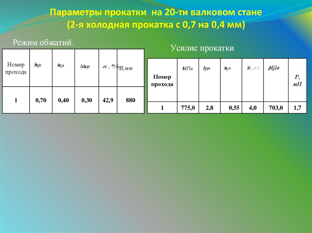Параметры прокатки на 20-ти валковом стане(2-я холодная прокатка с 0,7 на 0,4 мм)