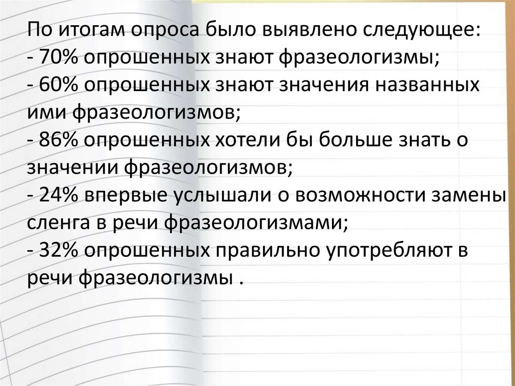 По итогам опроса было выявлено следующее:- 70% опрошенных знают фразеологизмы;