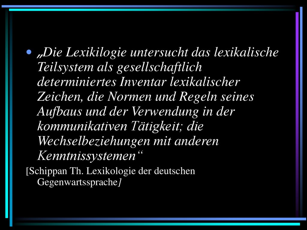 • „Die Lexikilogie untersucht das lexikalischeTeilsystem als gesellschaftlich