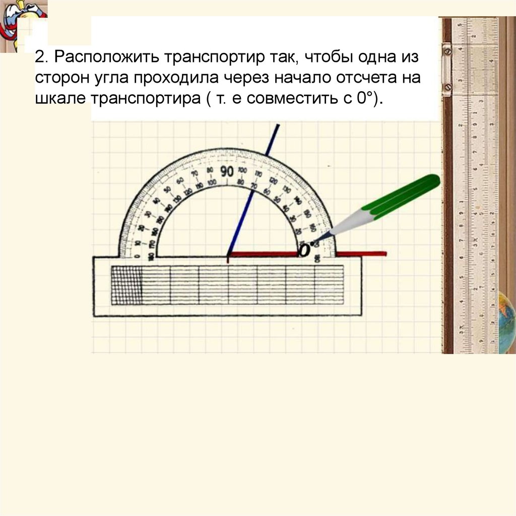2. Расположить транспортир так, чтобы одна изсторон угла проходила через начало отсчета на