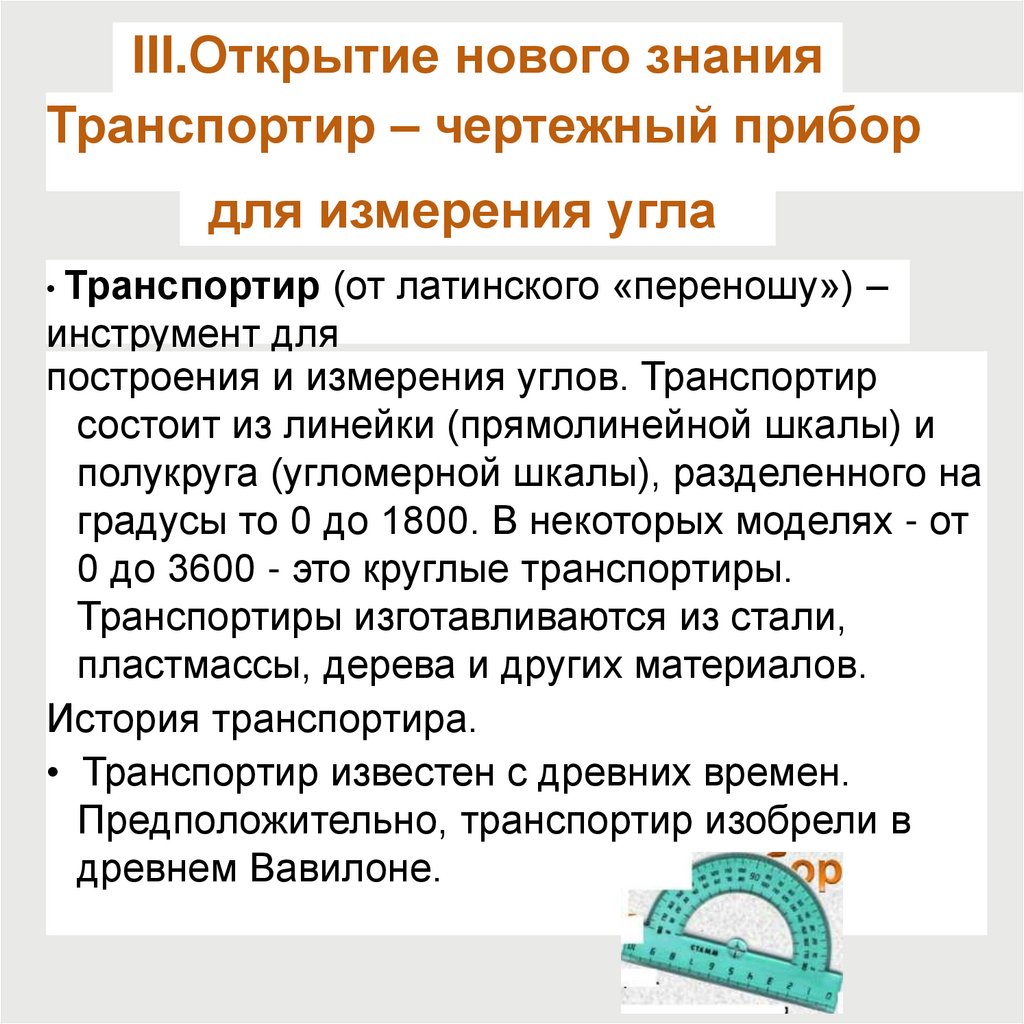 III.Открытие нового знанияТранспортир – чертежный прибор