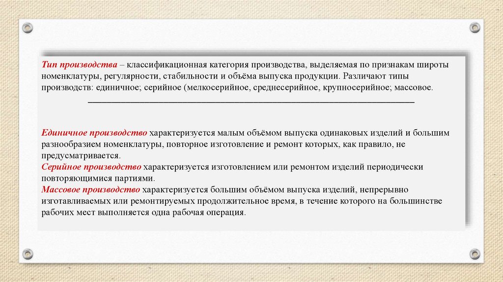 Тип производства – классификационная категория производства, выделяемая по признакам широтыноменклатуры, регулярности, стабильности и объёма выпуска продукции. Различают типы