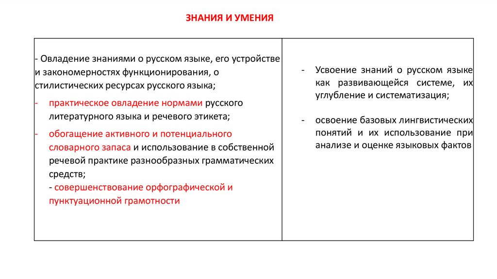 ЗНАНИЯ И УМЕНИЯ- Овладение знаниями о русском языке, его устройстве