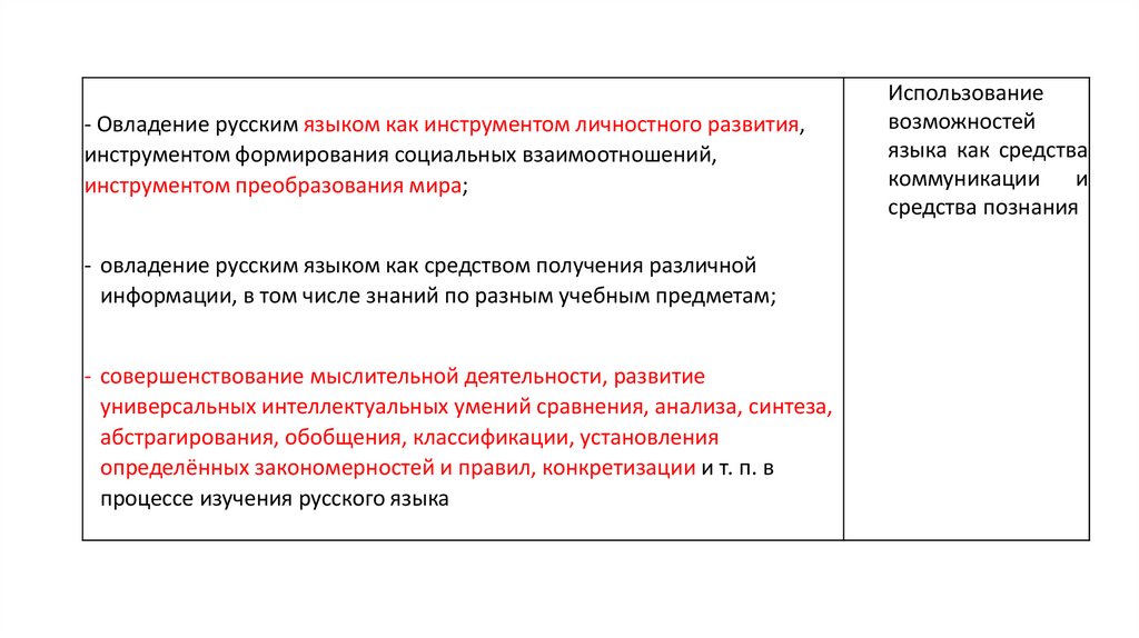 - Овладение русским языком как инструментом личностного развития,инструментом формирования социальных взаимоотношений,