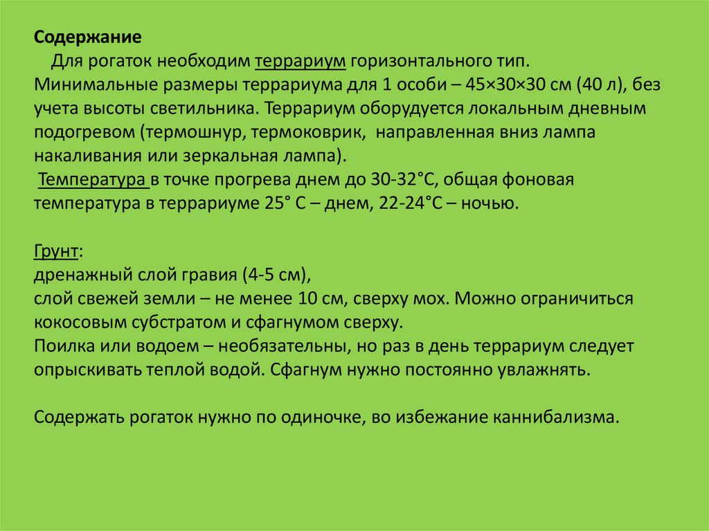 СодержаниеДля рогаток необходим террариум горизонтального тип.