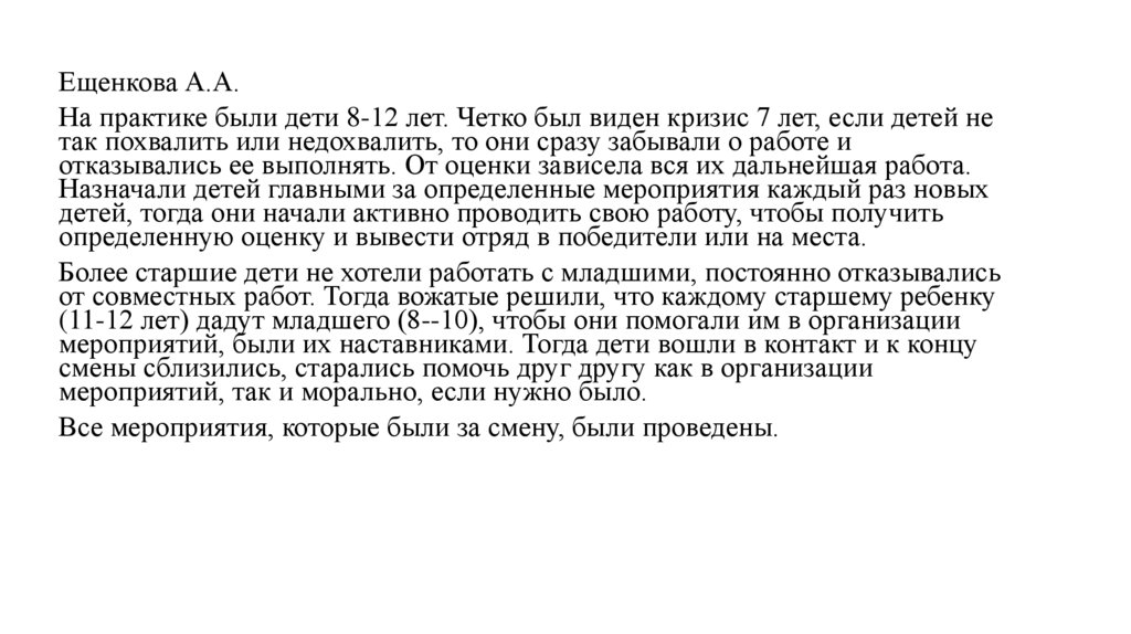 Ещенкова А.А.На практике были дети 8-12 лет. Четко был виден кризис 7 лет, если детей не
