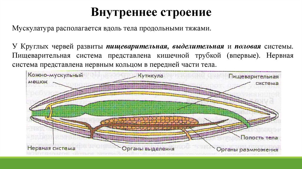 Внутреннее строениеМускулатура располагается вдоль тела продольными тяжами.