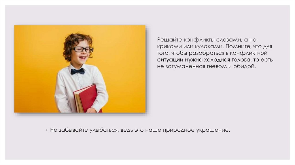 Решайте конфликты словами, а некриками или кулаками. Помните, что для