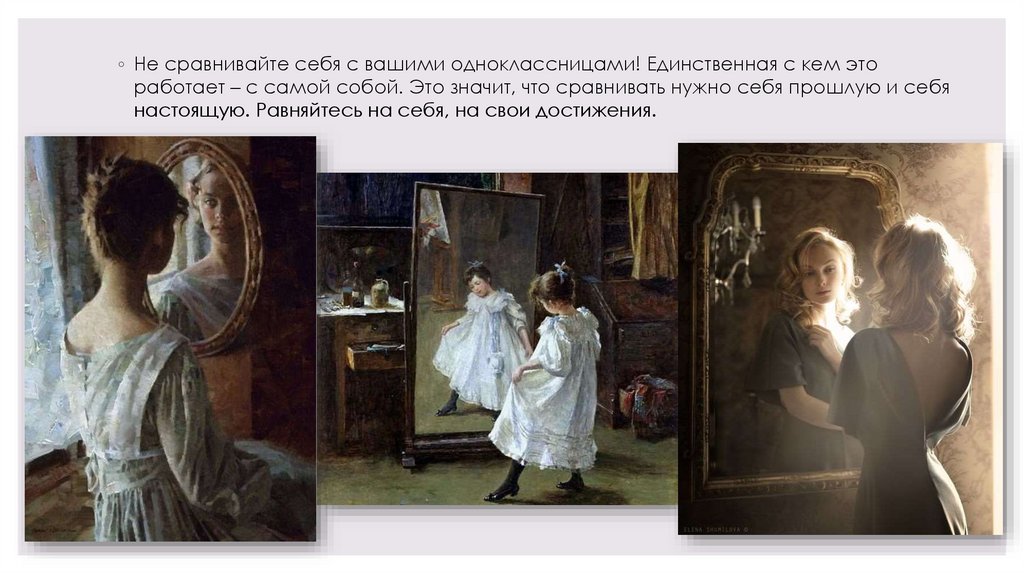 ◦ Не сравнивайте себя с вашими одноклассницами! Единственная с кем этоработает – с самой собой. Это значит, что сравнивать нужно себя прошлую и себя