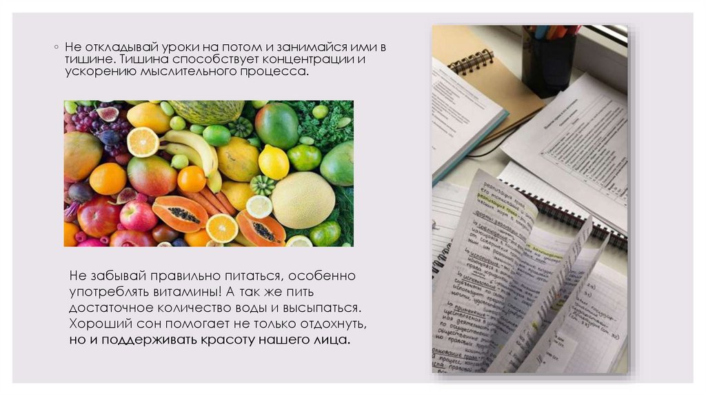 ◦ Не откладывай уроки на потом и занимайся ими втишине. Тишина способствует концентрации и