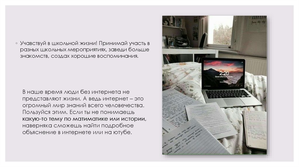 ◦ Учавствуй в школьной жизни! Принимай участь вразных школьных мероприятиях, заведи больше