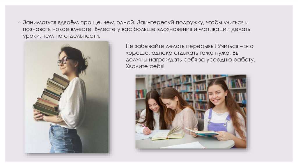 ◦ Заниматься вдвоём проще, чем одной. Заинтересуй подружку, чтобы учиться ипознавать новое вместе. Вместе у вас больше вдохновения и мотивации делать