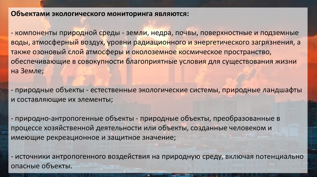 Объектами экологического мониторинга являются:- компоненты природной среды - земли, недра, почвы, поверхностные и подземные