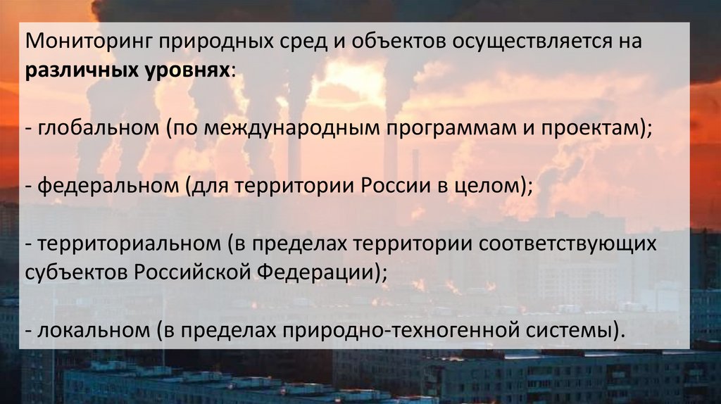 Мониторинг природных сред и объектов осуществляется наразличных уровнях: