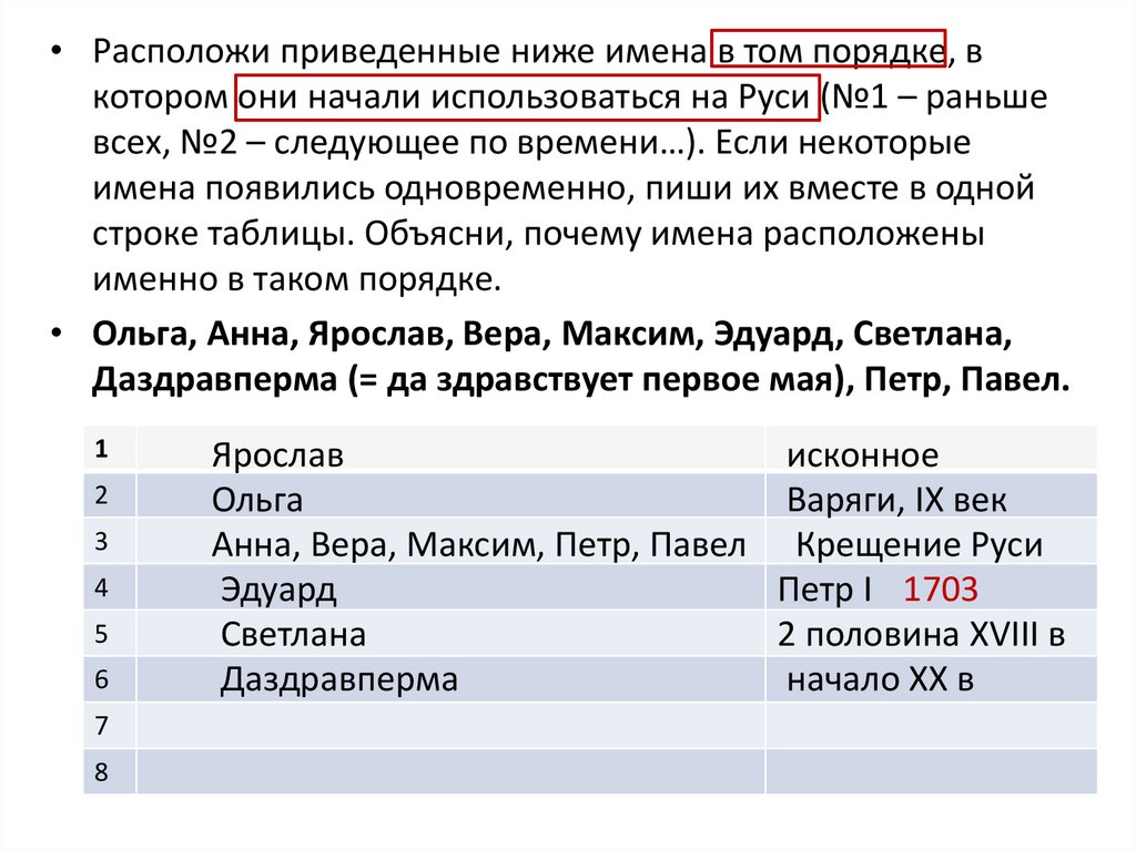 • Расположи приведенные ниже имена в том порядке, вкотором они начали использоваться на Руси (№1 – раньше
