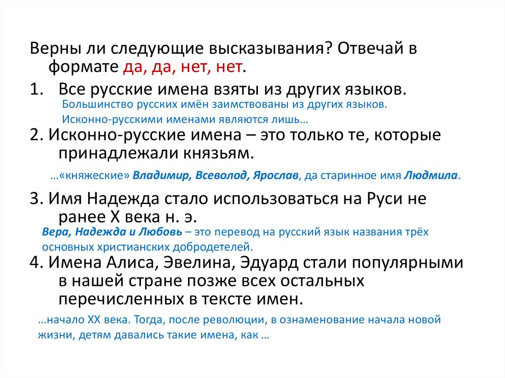 Большинство русских имён заимствованы из других языков.Исконно-русскими именами являются лишь «княжеские» Владимир,