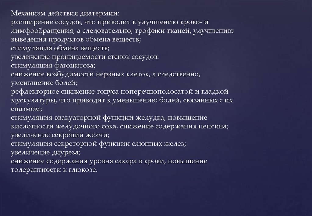 Механизм действия диатермии:расширение сосудов, что приводит к улучшению крово- и