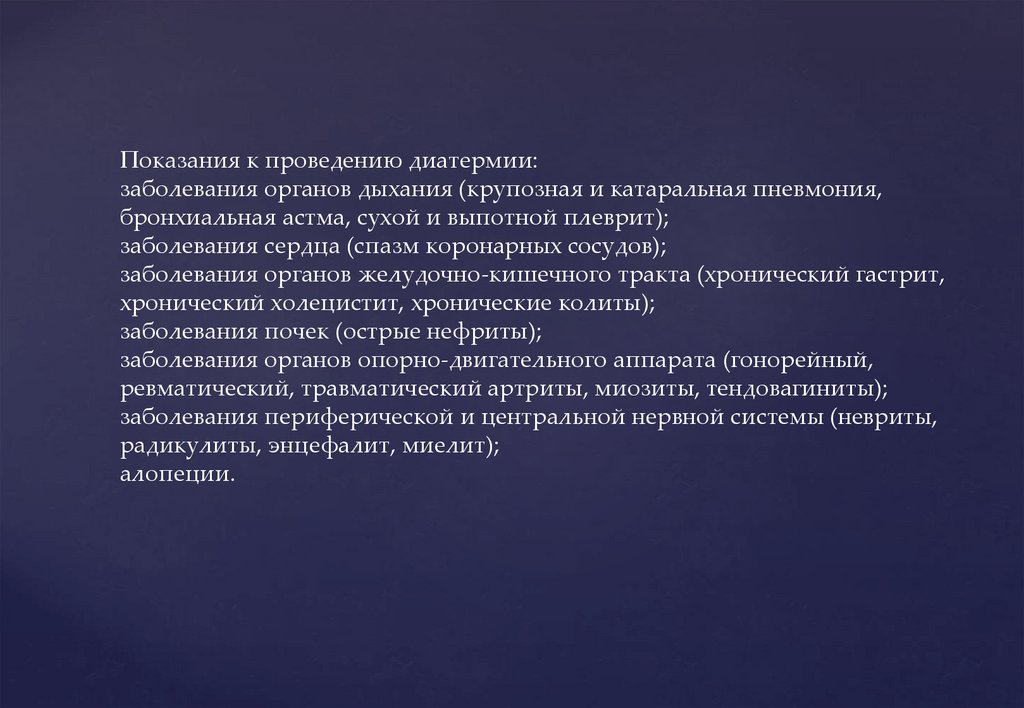 Показания к проведению диатермии:заболевания органов дыхания (крупозная и катаральная пневмония,