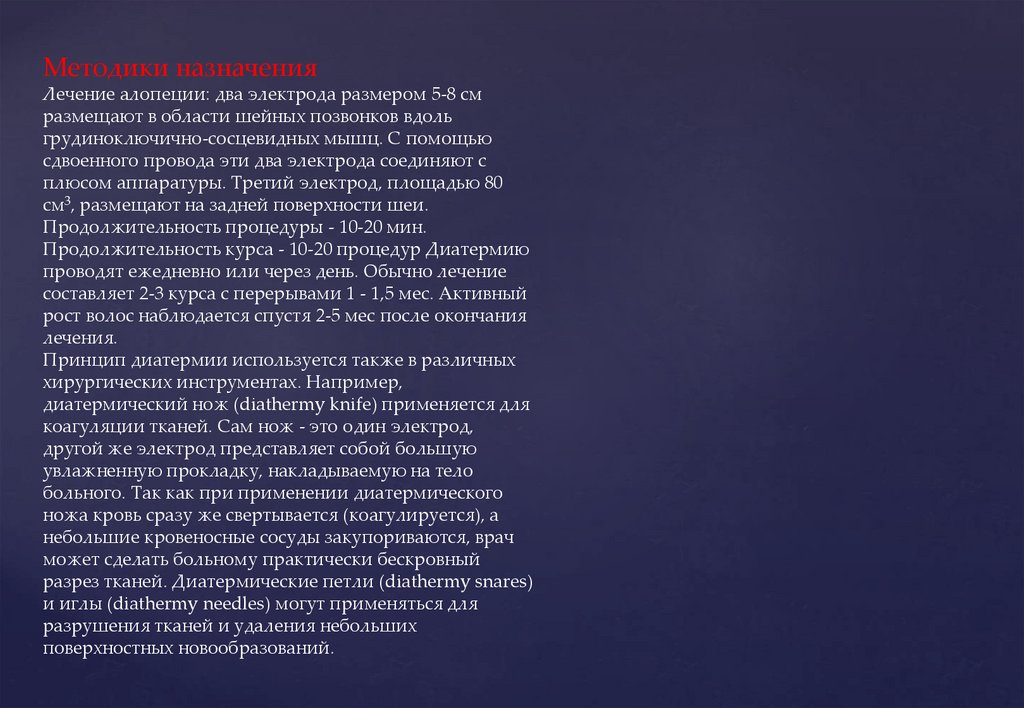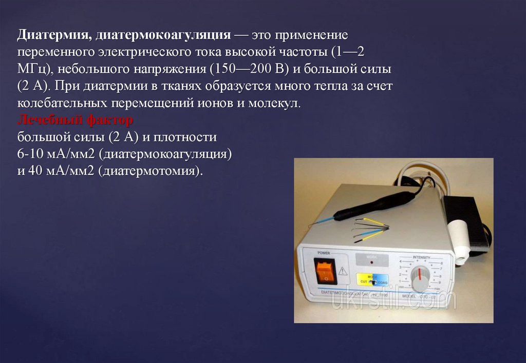 настоящее время не используется. В основе диатермии воздействие переменного тока высокой частоты (до 2 мГц),