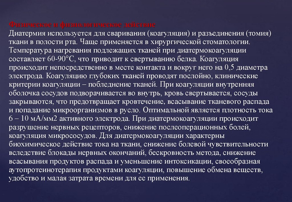 Физическое и физиологическое действиеДиатермия используется для сваривания (коагуляция) и разъединения (томия)