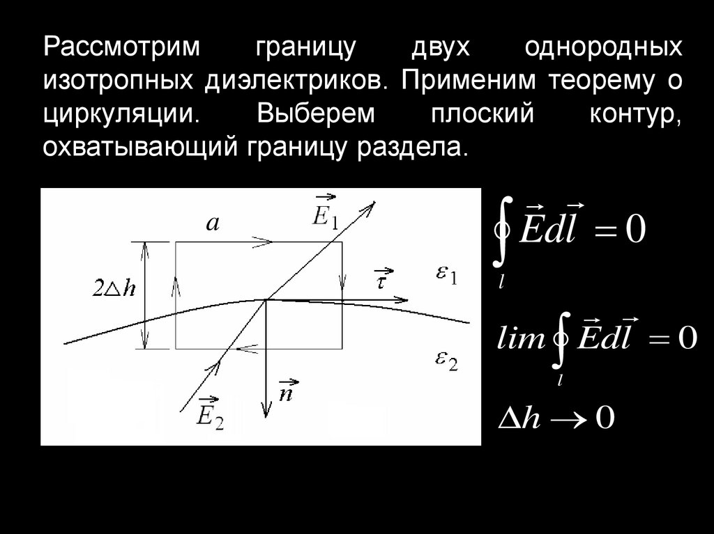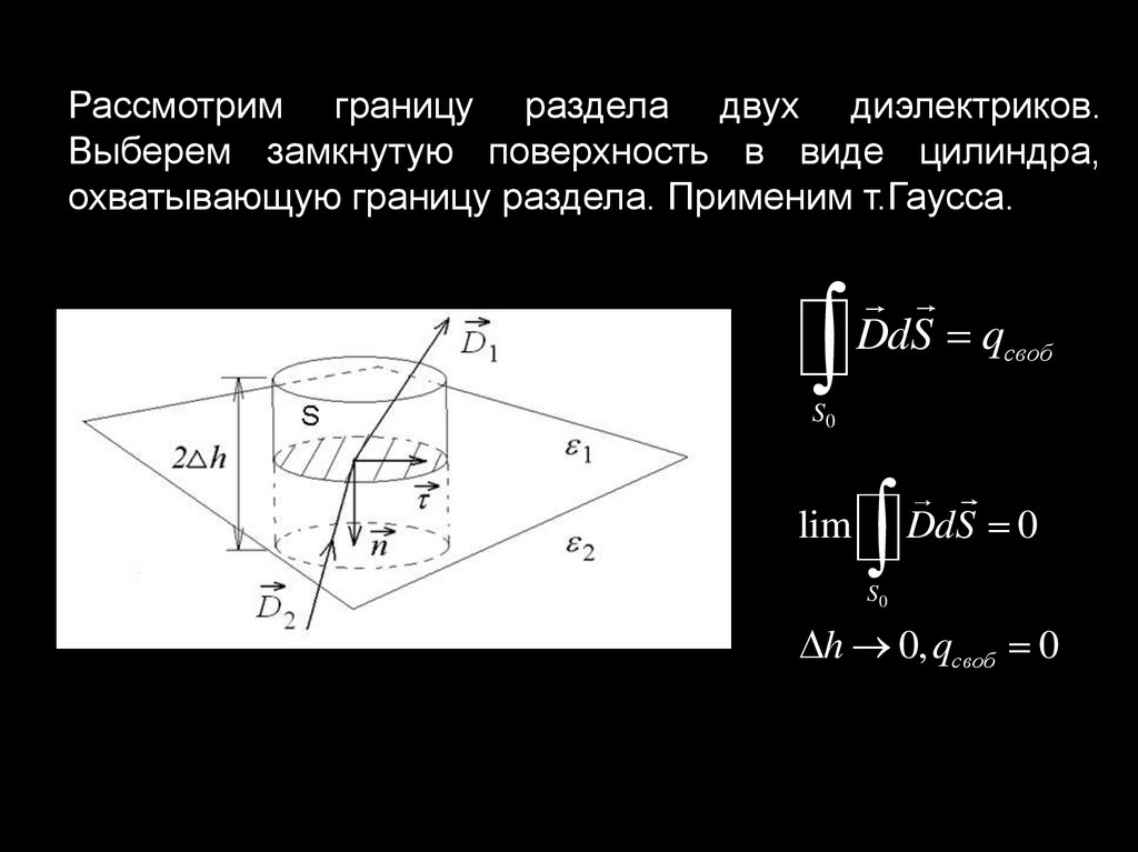 Рассмотрим границу раздела двух диэлектриков.Выберем замкнутую поверхность в виде цилиндра,