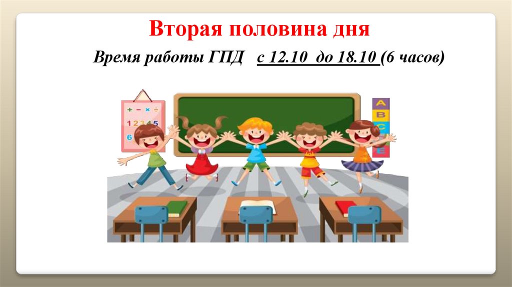 Вторая половина дняВремя работы ГПД с 12.10 до 18.10 (6 часов)
