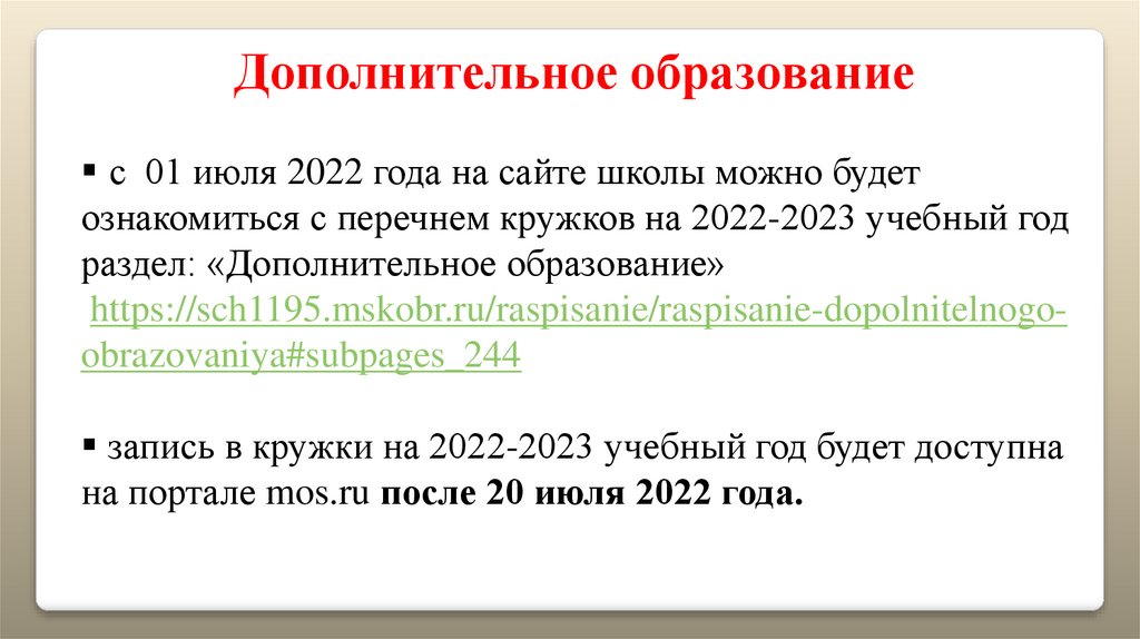 Дополнительное образованиес 01 июля 2022 года на сайте школы можно будет