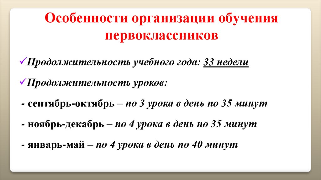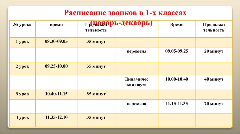 - ноябрь-декабрь – по 4 урока в день по 35 минут