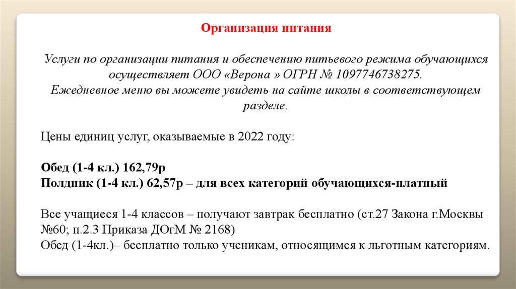 Обед (1-4кл.)– бесплатно только ученикам, относящимся к льготным категориям.