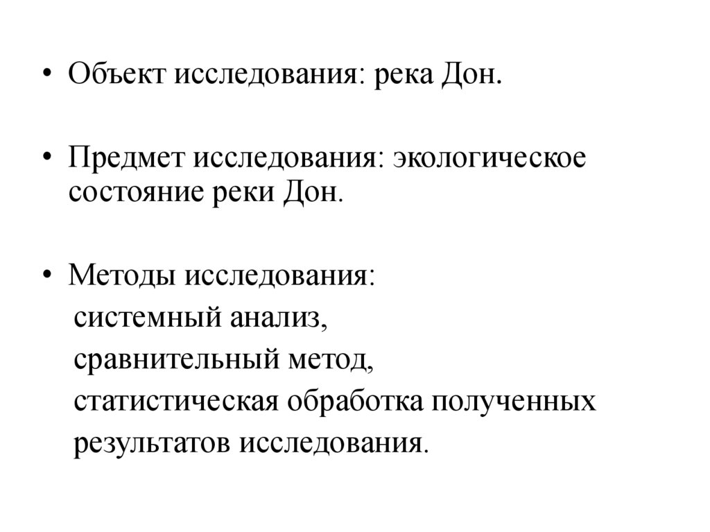 • Объект исследования: река Дон.• Предмет исследования: экологическое