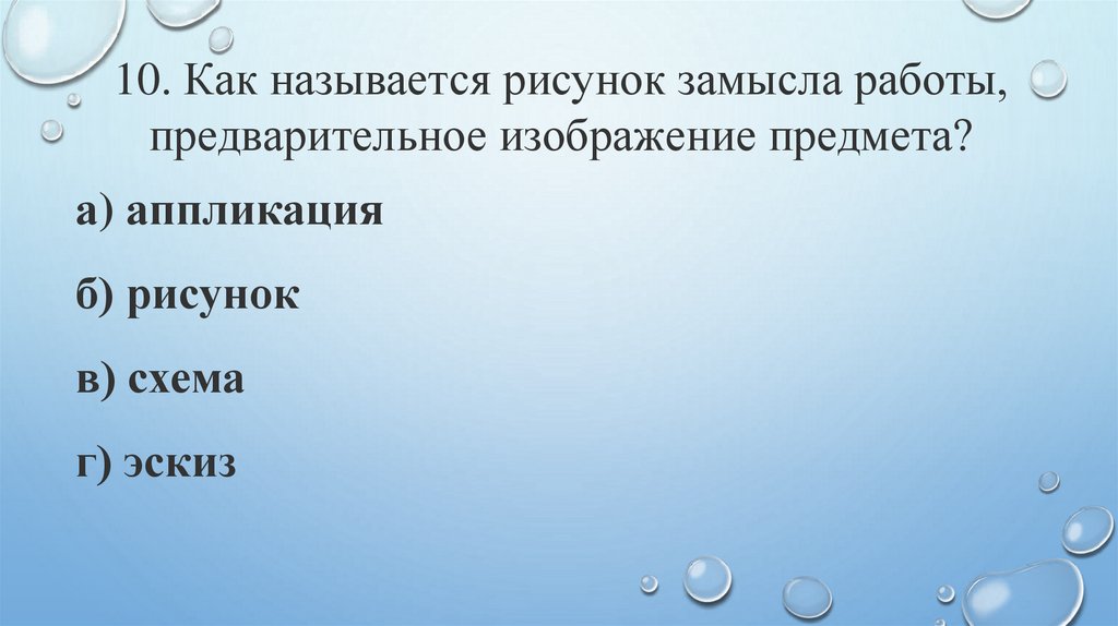 10. Как называется рисунок замысла работы,предварительное изображение предмета?