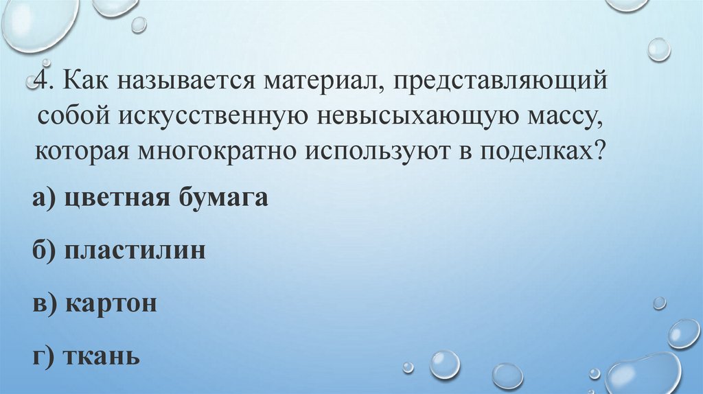 4. Как называется материал, представляющийсобой искусственную невысыхающую массу,