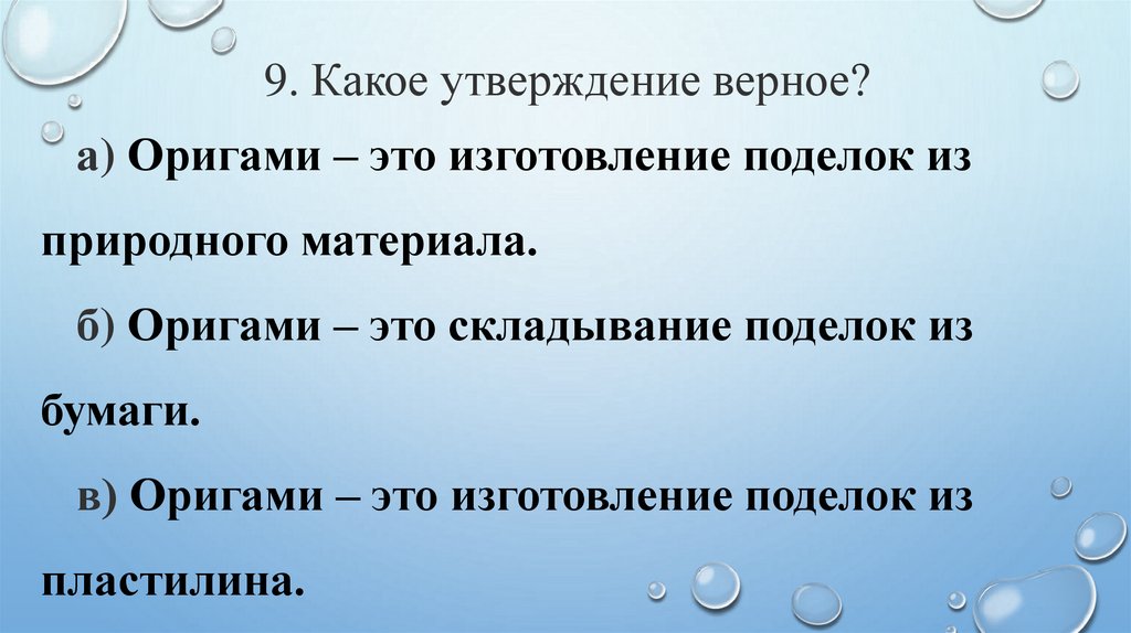 9. Какое утверждение верное?а) Оригами – это изготовление поделок из
