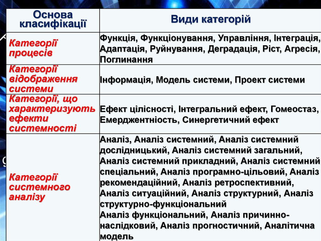 13. Дайте класифікацію основних категорій системного