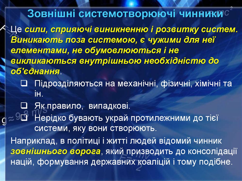 Зовнішні системотворюючі чинникиЦе сили, сприяючі виникненню і розвитку систем.