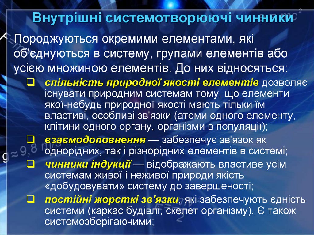 Внутрішні системотворюючі чинникиПороджуються окремими елементами, які