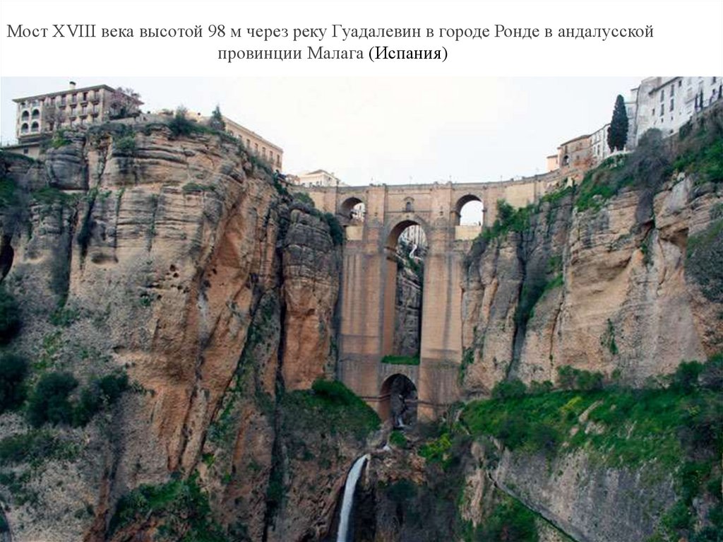 Мост XVIII века высотой 98 м через реку Гуадалевин в городе Ронде в андалусскойпровинции Малага (Испания)