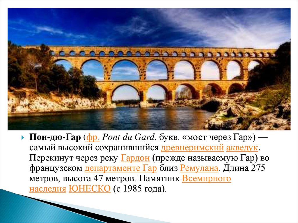 Пон-дю-Гар (фр. Pont du Gard, букв. «мост через Гар») —самый высокий сохранившийся древнеримский акведук.