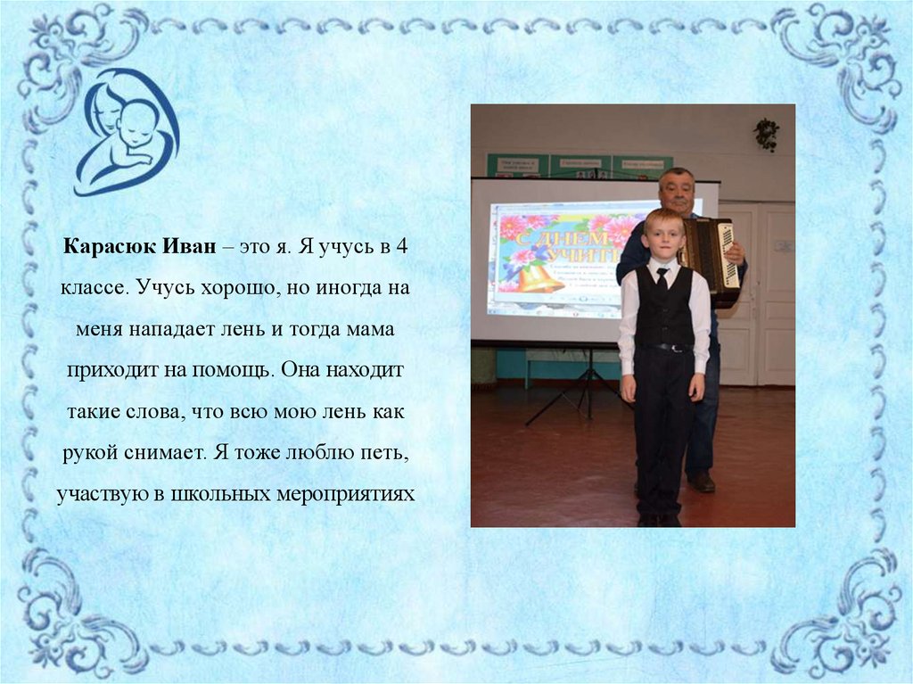 Карасюк Иван – это я. Я учусь в 4классе. Учусь хорошо, но иногда на